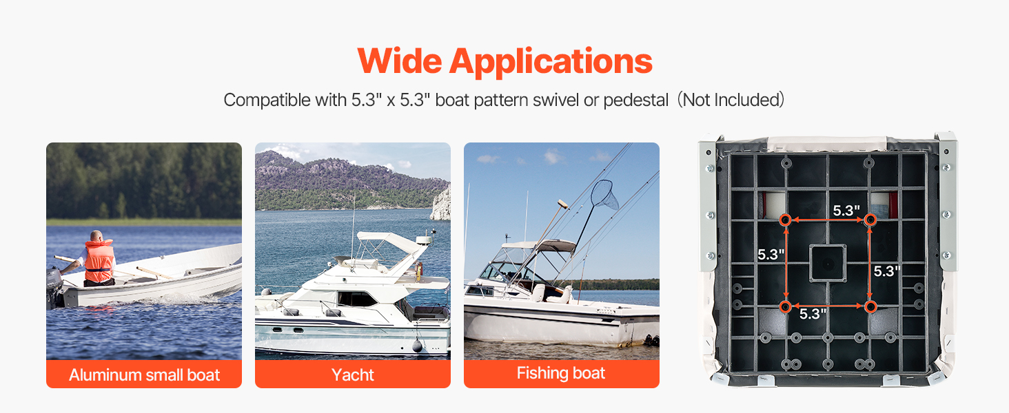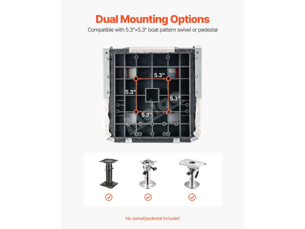 Spodné montážne otvory majú rozmery 5,3 x 5,3 palca, čo umožňuje umiestniť sedadlo do rybárskeho člna priamo na plošinu alebo ho namontovať na väčšinu podstavcov. Upozornenie: otočné podstavce a podperné základne nie sú súčasťou balenia.
