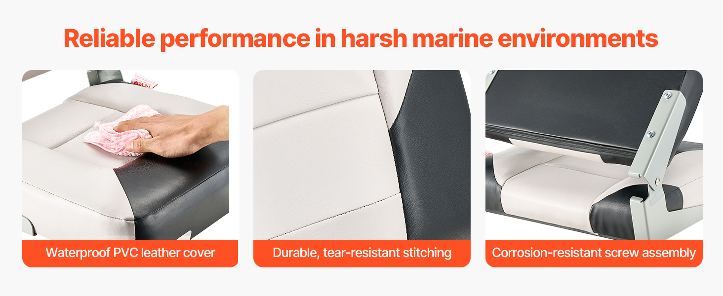 Toto sedadlo do člna je obalené odolnou, pevne prešitou kožou z PVC a upevnené kovovými skrutkami odolnými proti korózii, je vodotesné, odolné proti korózii a skonštruované tak, aby odolalo živlom. Či už ide o slanú vodu, slnko alebo dážď, toto sedadlo si zachováva svoju výkonnosť a zabezpečuje dlhotrvajúcu jazdu na vode.