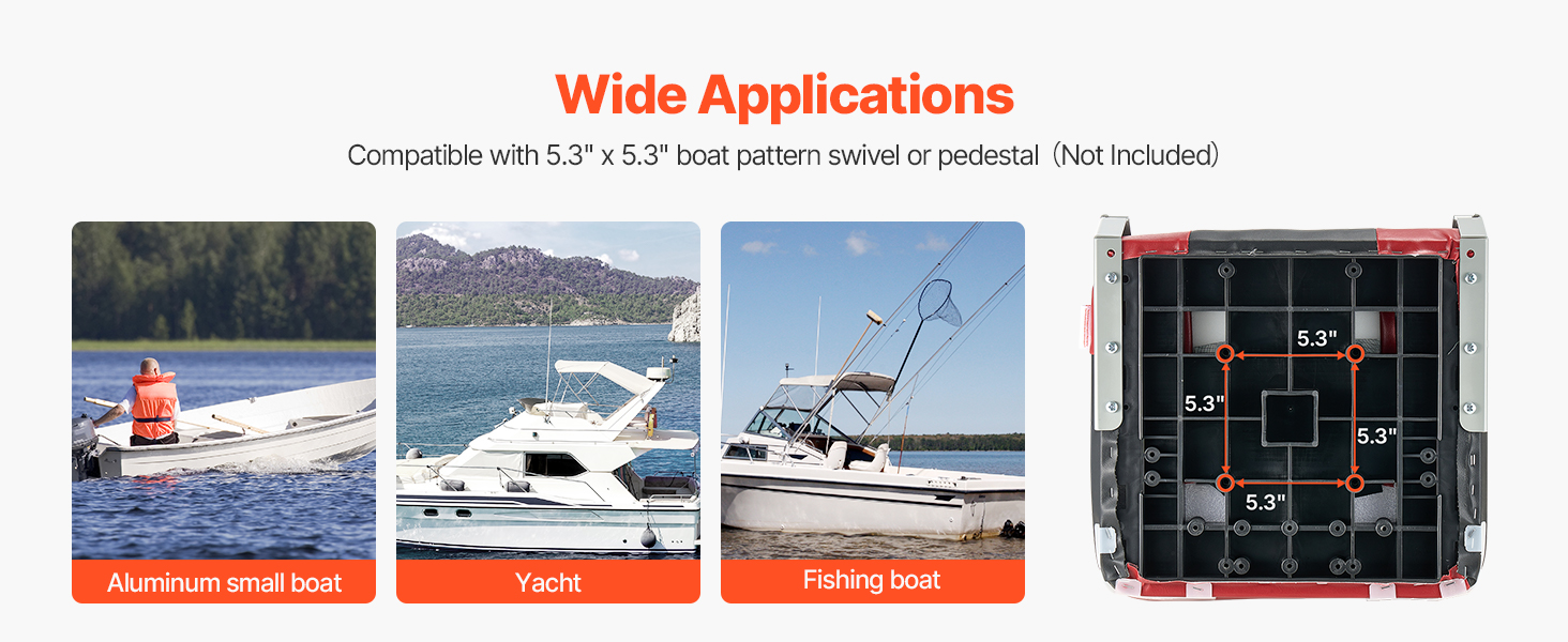 Spodné montážne otvory majú rozmery 5,3 x 5,3 palca, čo umožňuje umiestniť sedadlo do rybárskeho člna priamo na plošinu alebo ho namontovať na väčšinu podstavcov. Upozornenie: otočné podstavce a podperné základne nie sú súčasťou balenia.