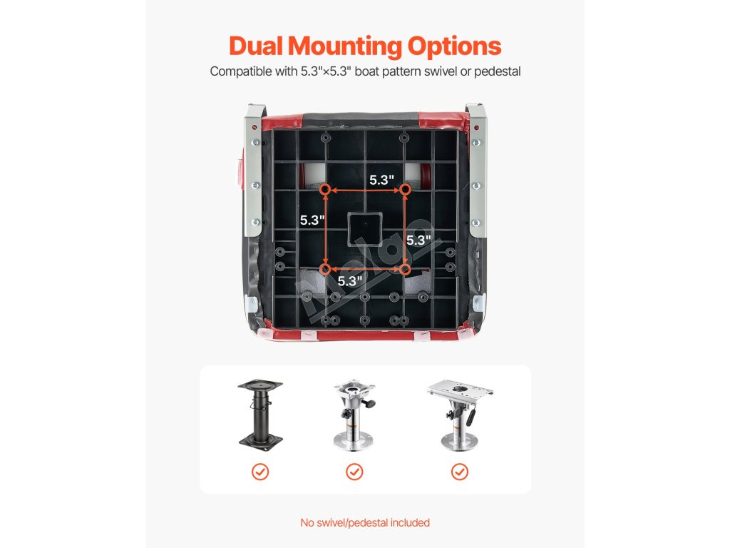 Spodné montážne otvory majú rozmery 5,3 x 5,3 palca, čo umožňuje umiestniť sedadlo do rybárskeho člna priamo na plošinu alebo ho namontovať na väčšinu podstavcov. Upozornenie: otočné podstavce a podperné základne nie sú súčasťou balenia.