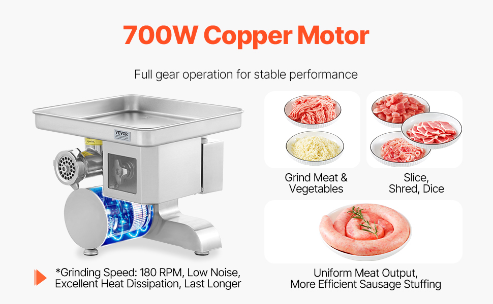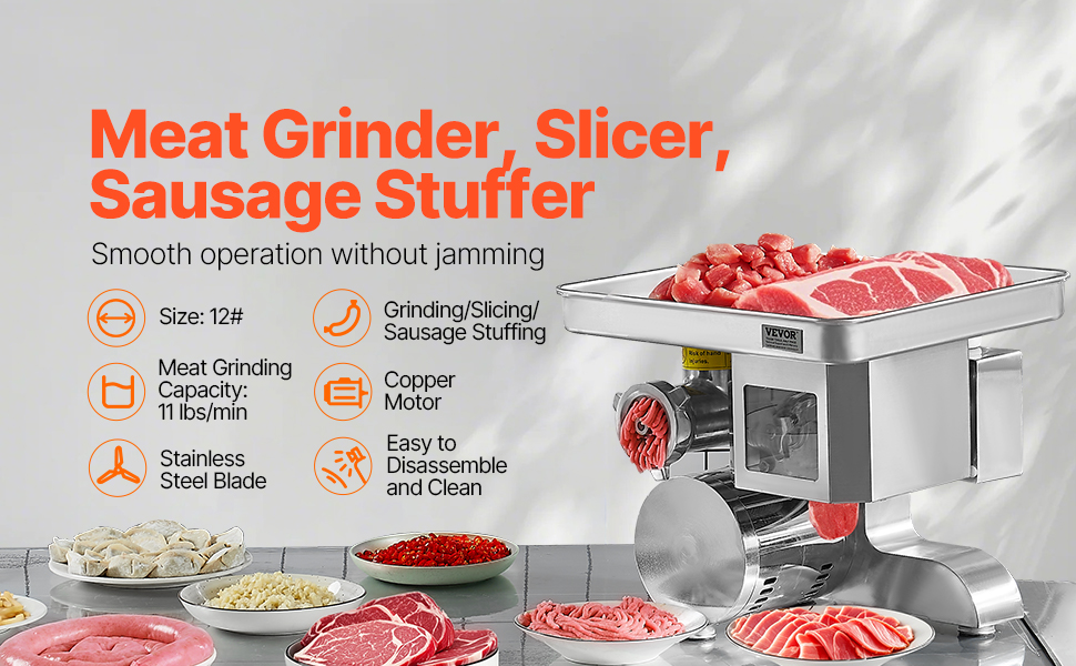Tento elektrický mlynček na mäso a krájač kombinuje mletie, krájanie a plnenie klobás v jednom prístroji, čím zabezpečuje plynulú prevádzku bez zasekávania. Špirálový lisovací mechanizmus udržiava mäso hustejšie, čo vedie k rovnomernému výstupu a efektívnemu plneniu klobás, ideálnemu na vytváranie jedinečne ochutených pokrmov.