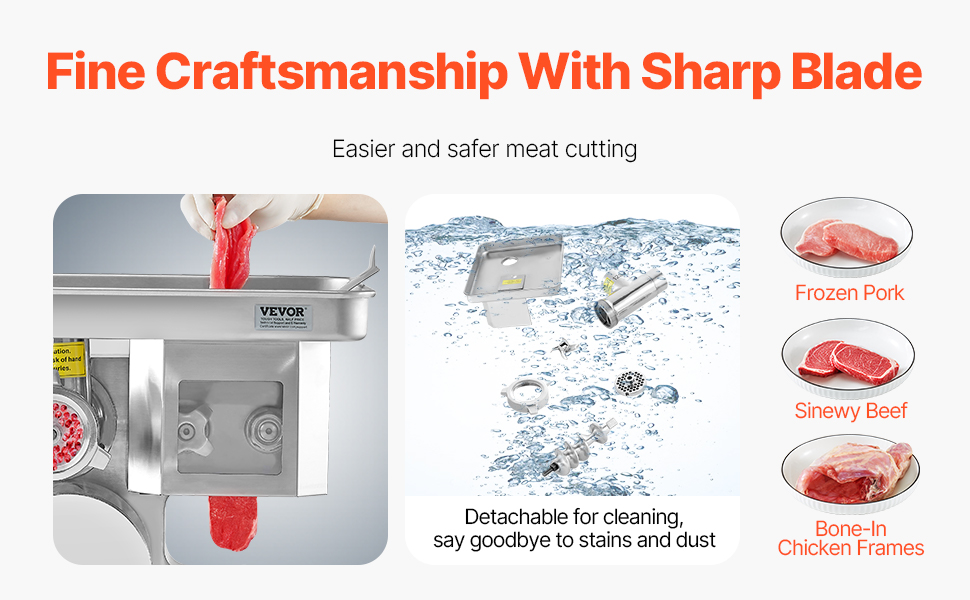 Hrubý, ostrý nôž umožňuje rýchle rezanie, čím uľahčuje mletie mäsa. Odnímateľná čepeľ umožňuje jednoduché čistenie zvyškov mäsa, tuku a škvŕn.