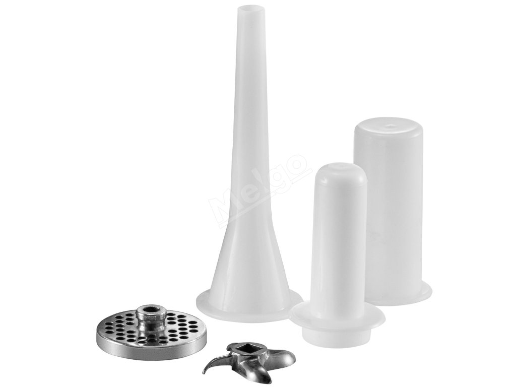 Poskytneme vám kompletné príslušenstvo, ako je mlecia doska s priemerom 6 mm, mlecia doska s priemerom 8 mm, 2 ostré nože, zásobník na mäso, hrdlo, tlačná tyč, súprava na klobásy a niektoré inštalačné komponenty.