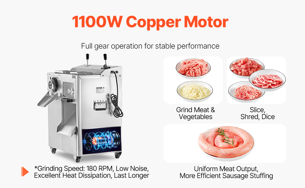 Tento elektrický mlynček na mäso a krájač kombinuje mletie, krájanie a plnenie klobás v jednom prístroji, čím zabezpečuje plynulú prevádzku bez zasekávania. Špirálový lisovací mechanizmus udržiava mäso hustejšie, čo vedie k rovnomernému výstupu a efektívnemu plneniu klobás, ktoré je ideálne na vytváranie jedinečne ochutených pokrmov.