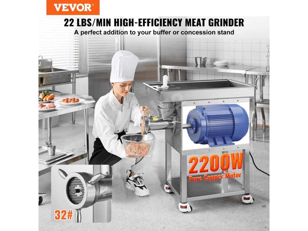 Komerčný mlynček na mäso s veľkosťou úst 32# je vybavený vysoko účinným 2200W motorom z čistej medi, ktorý dokáže zomlieť 22 libier mäsa za minútu. Dokáže pracovať nepretržite viac ako 6 hodín, takže je ideálny pre potreby komerčného mletia mäsa vo veľkom rozsahu.