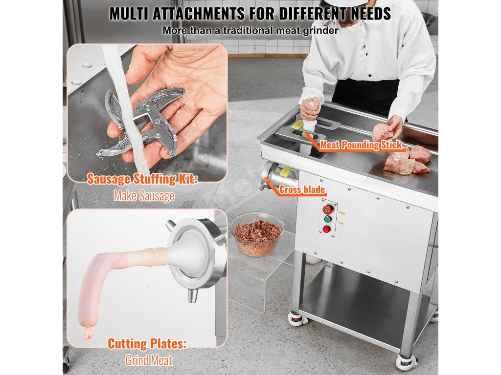 Prístroj sa dodáva s plničkou na klobásy a reznou doskou, čo umožňuje nielen mletie mäsa, ale aj výrobu klobás. Možno ho použiť na mletie rôznych druhov mäsa, ako je bravčové, hovädzie, zverina, kuracie mäso a ryby.