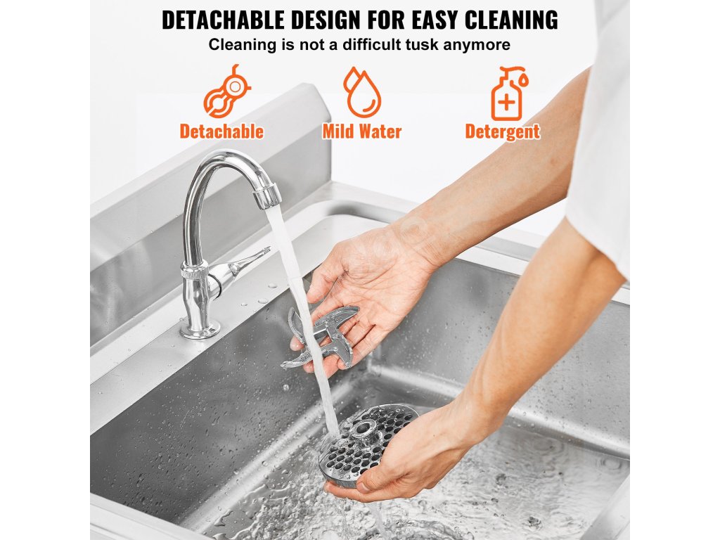 Celý stroj je vyrobený z nehrdzavejúcej ocele s ostrými nožmi SUS420, ktoré sú odolné a dokážu mlieť kuracie chrupavky, mrazené mäso a ďalšie.