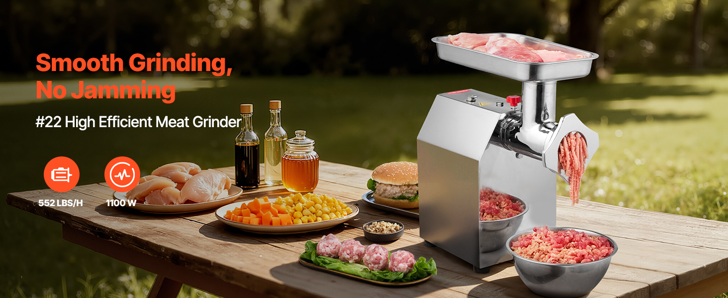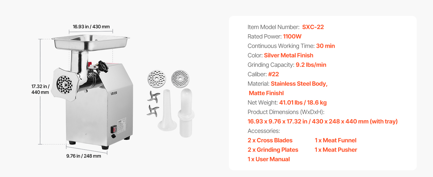 Komerčný stolový mlynček na mäso s veľkosťou úst 22# je vybavený vysoko účinným 1100W motorom z čistej medi, ktorý dokáže zomlieť 9,2 kg mäsa za minútu. Je vyrobený z nehrdzavejúcej ocele, je robustný a odolný. Čepeľ SUS420, ktorá dokáže mlieť rôzne druhy mäsa, je ideálna na komerčné použitie.