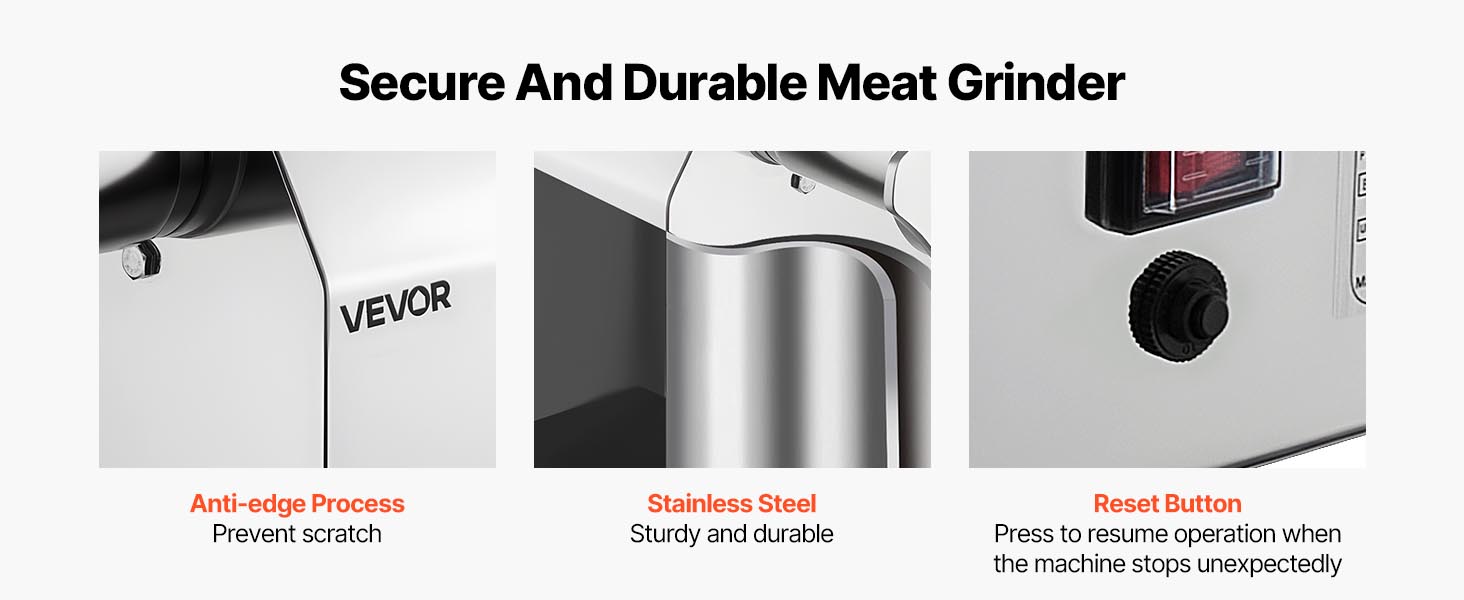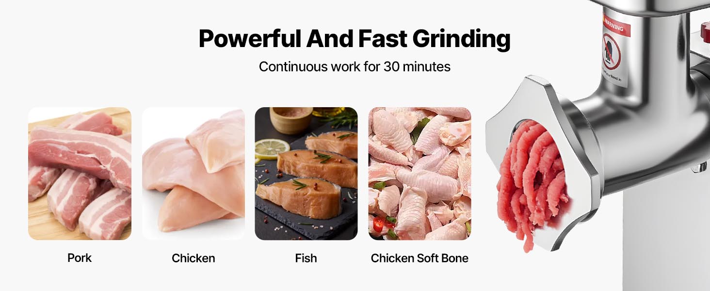 Motor z čistej medi s výkonom 1100 W dokáže zomlieť 9,2 libier mäsa za minútu. Elektrický mlynček na mäso môže pracovať nepretržite bez prerušenia, takže je ideálny pre potreby komerčného mletia mäsa vo veľkom rozsahu.