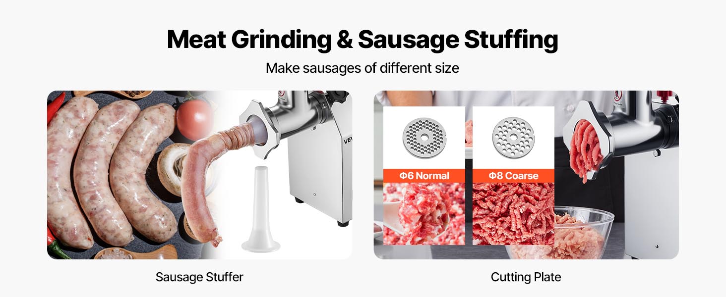 Komerčný mlynček na mäso obsahuje dve rezné dosky a plničku na klobásy, čo umožňuje mletie mäsa a výrobu klobás. Ideálny na použitie v kuchyniach, baroch, reštauráciách a potravinárskych prevádzkach.