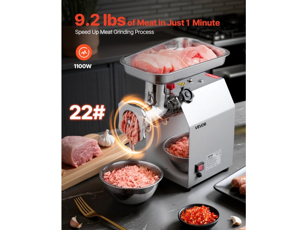 Motor z čistej medi s výkonom 1100 W dokáže zomlieť 9,2 libier mäsa za minútu. Elektrický mlynček na mäso môže pracovať nepretržite bez prerušenia, takže je ideálny pre potreby komerčného mletia mäsa vo veľkom rozsahu.