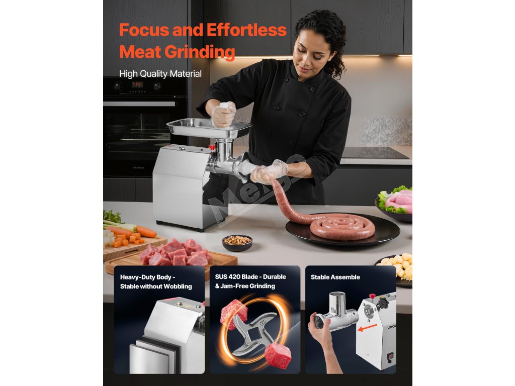 Komerčný mlynček na mäso obsahuje dve rezné dosky a plničku na klobásy, čo umožňuje mletie mäsa a výrobu klobás. Ideálny na použitie v kuchyniach, baroch, reštauráciách a potravinárskych prevádzkach.