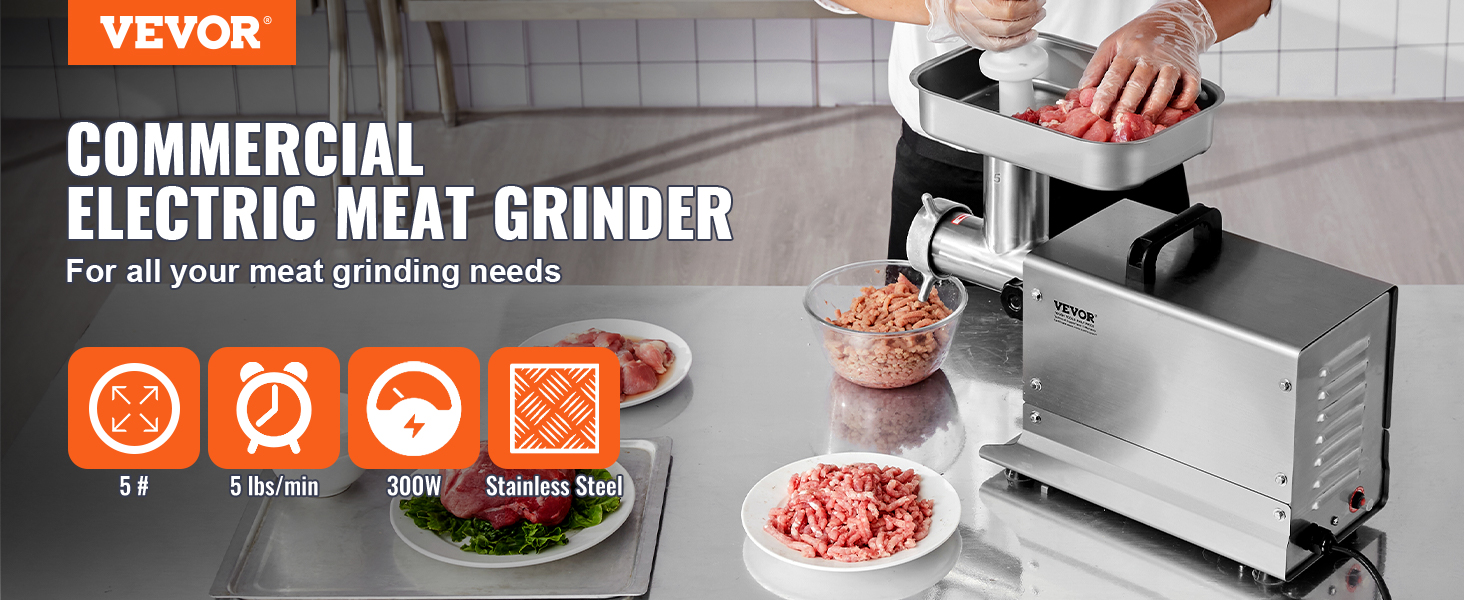Komerčný stolový mlynček na mäso s veľkosťou úst 5# je vybavený vysoko účinným 300W motorom z čistej medi, ktorý dokáže zomlieť 5 libier mäsa za minútu. Je vyrobený z nehrdzavejúcej ocele, je robustný a odolný. Čepeľ SUS420, ktorá dokáže mlieť rôzne druhy mäsa, je ideálna na komerčné použitie.