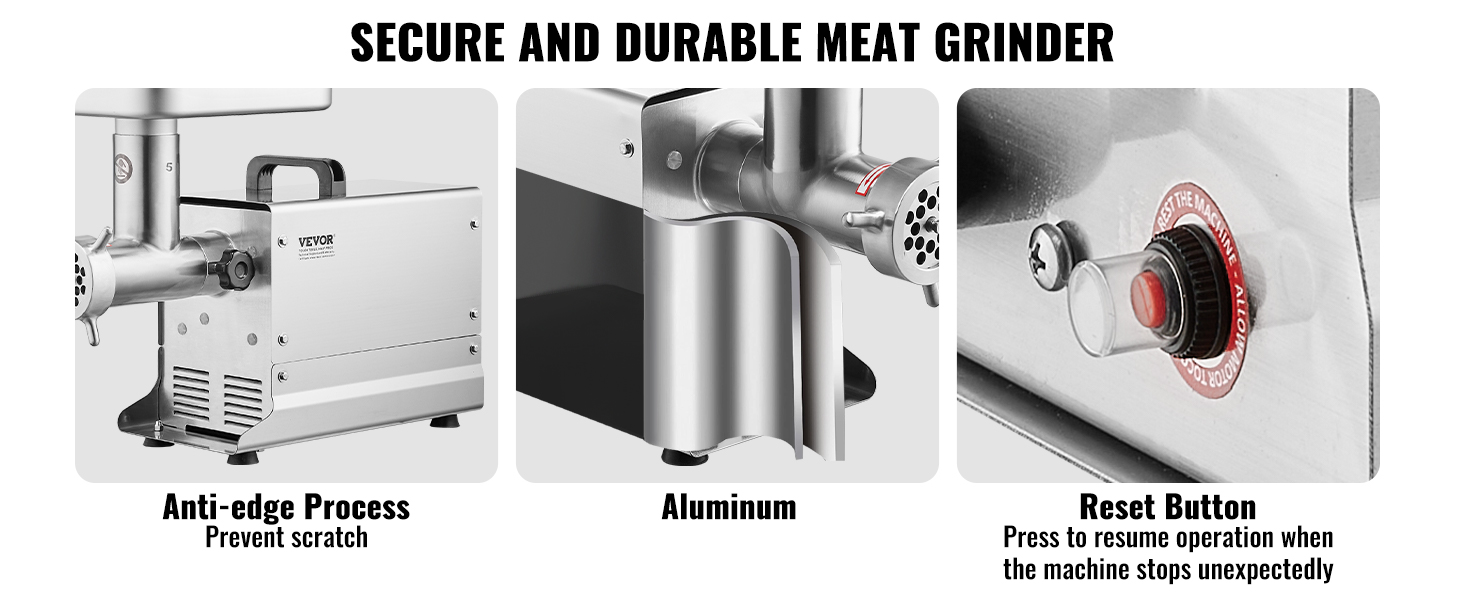 Motor z čistej medi s výkonom 300 W dokáže zomlieť 5 libier mäsa za minútu. Elektrický mlynček na mäso môže pracovať nepretržite bez prerušenia, takže je ideálny pre potreby komerčného mletia mäsa vo veľkom rozsahu.