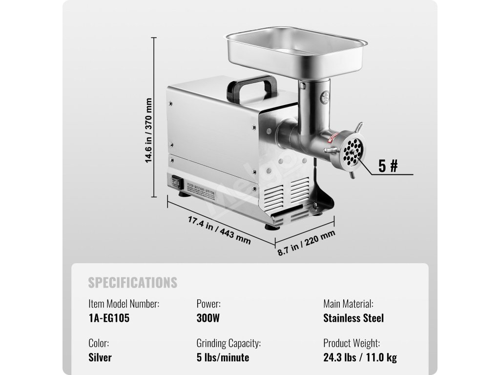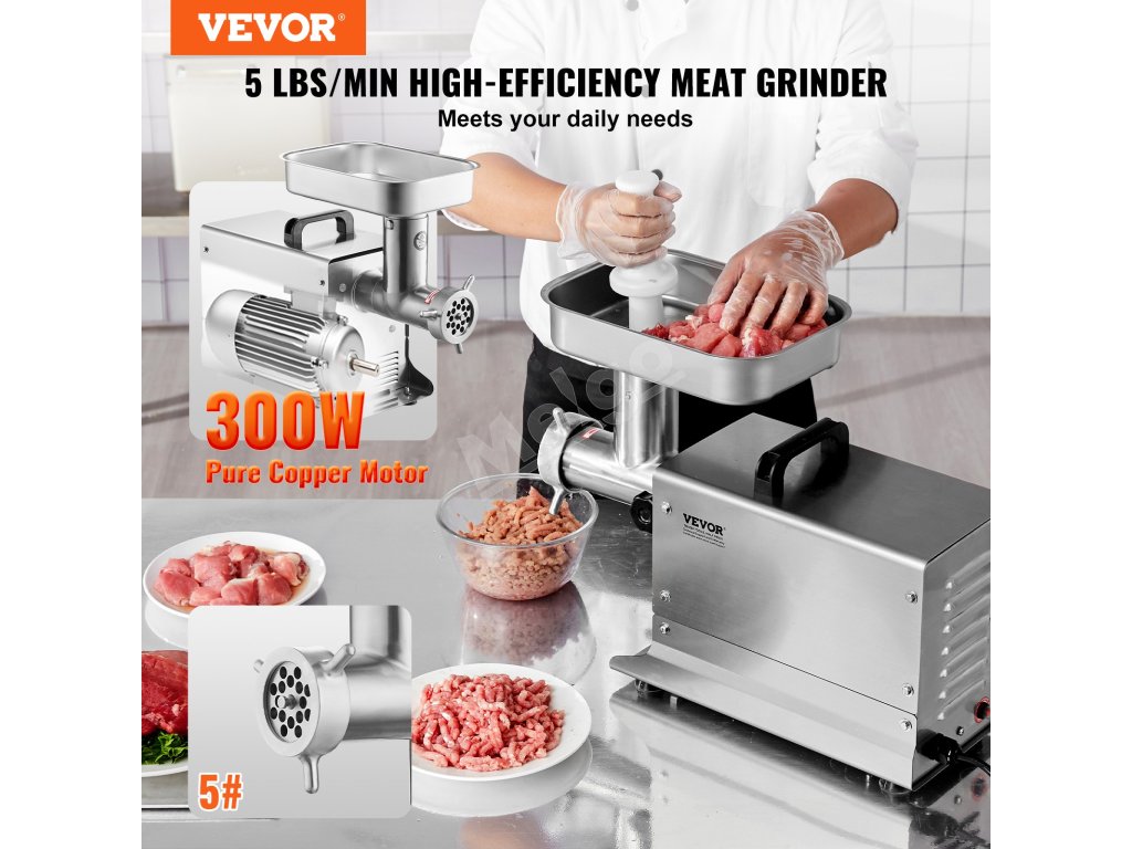 Motor z čistej medi s výkonom 300 W dokáže zomlieť 5 libier mäsa za minútu. Elektrický mlynček na mäso môže pracovať nepretržite bez prerušenia, takže je ideálny pre potreby komerčného mletia mäsa vo veľkom rozsahu.