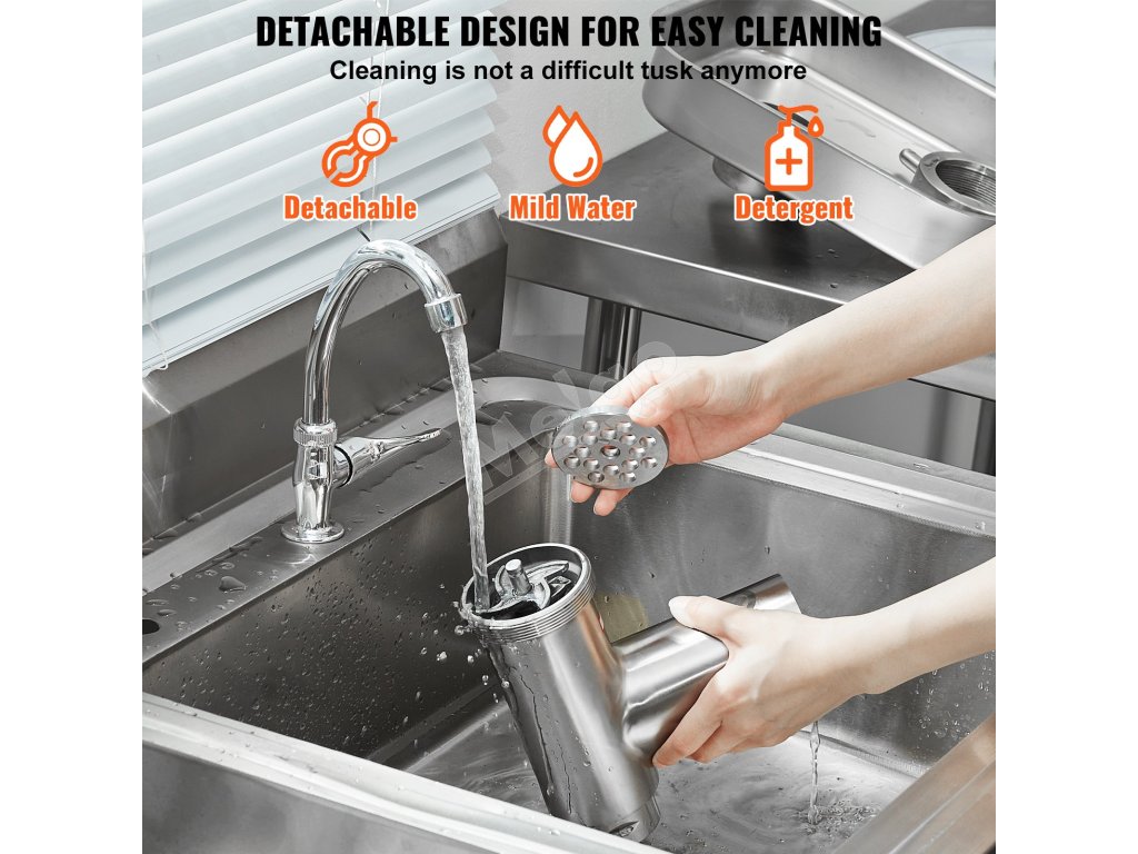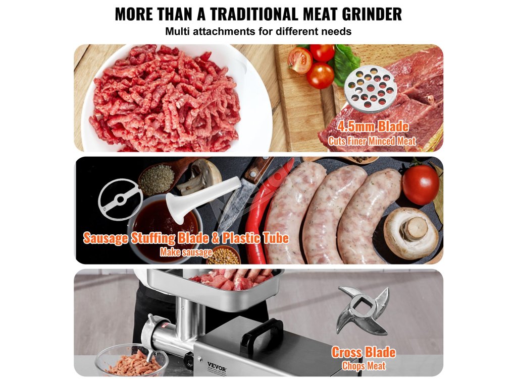 Komerčný mlynček na mäso obsahuje tri rôzne priemery trubiek na klobásy, vďaka čomu môžete ľahko vyrábať klobásy rôznych veľkostí. Ideálny na použitie v kuchyniach, baroch, reštauráciách a potravinárskych prevádzkach.