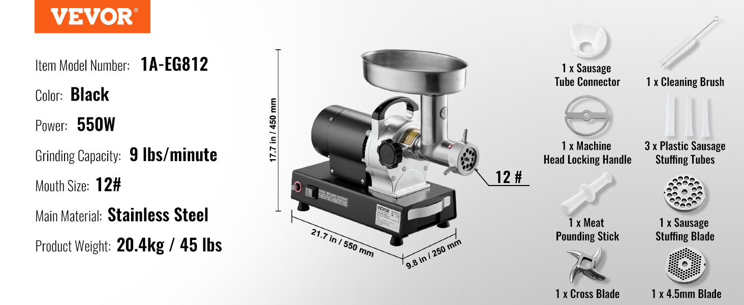 Komerčný stolový mlynček na mäso s veľkosťou úst 12# je vybavený vysoko účinným 550W motorom z čistej medi, ktorý dokáže zomlieť 9 libier mäsa za minútu. Je vyrobený z nehrdzavejúcej ocele, je robustný a odolný. Čepeľ SUS420, ktorá dokáže mlieť rôzne druhy mäsa, je ideálna na komerčné použitie.