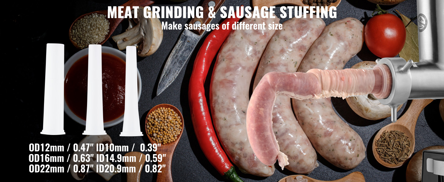 Komerčný mlynček na mäso obsahuje tri rôzne priemery trubiek na klobásy, vďaka čomu môžete ľahko vyrábať klobásy rôznych veľkostí. Ideálny na použitie v kuchyniach, baroch, reštauráciách a potravinárskych prevádzkach.
