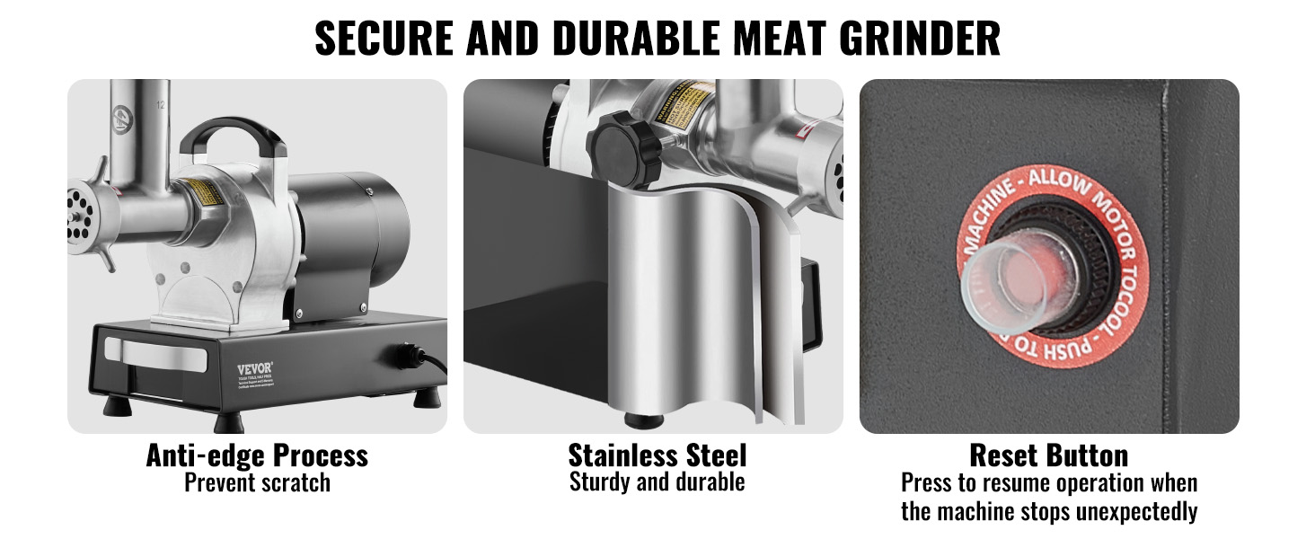 Motor z čistej medi s výkonom 550 W dokáže zomlieť 9 libier mäsa za minútu. Elektrický mlynček na mäso dokáže pracovať nepretržite bez prerušenia, takže je ideálny pre potreby komerčného mletia mäsa vo veľkom rozsahu.