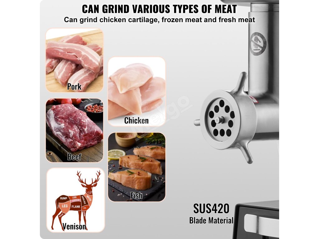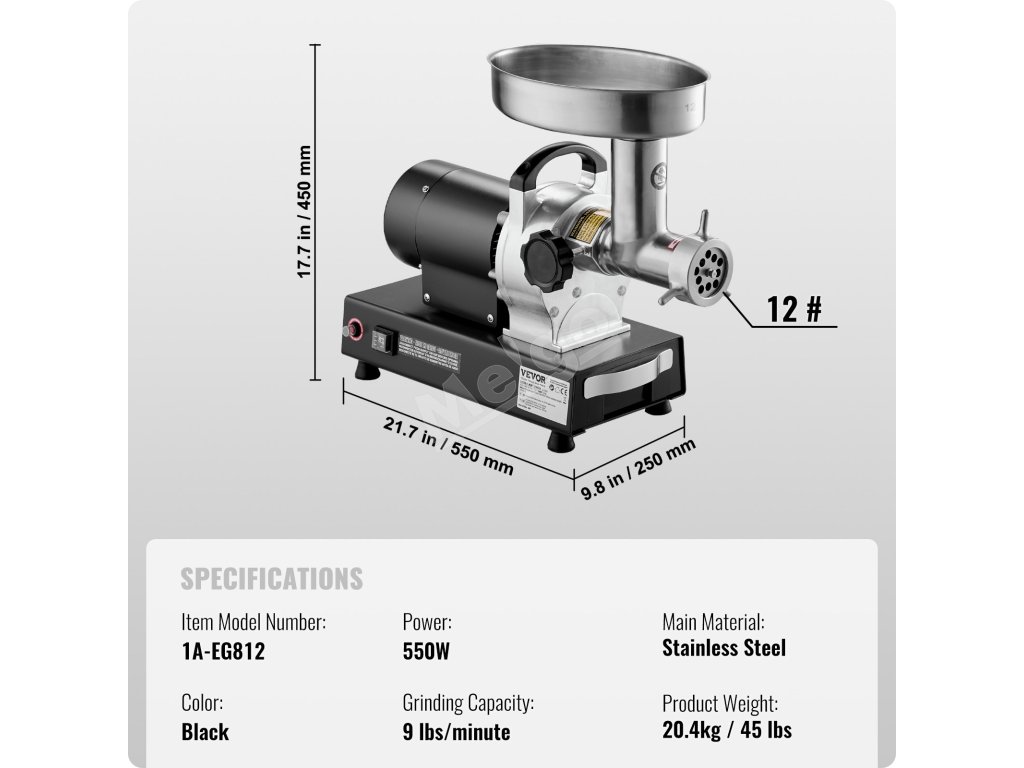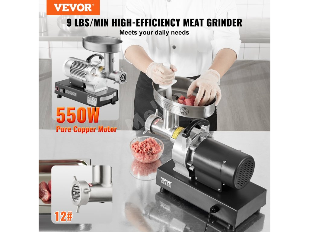Motor z čistej medi s výkonom 550 W dokáže zomlieť 9 libier mäsa za minútu. Elektrický mlynček na mäso dokáže pracovať nepretržite bez prerušenia, takže je ideálny pre potreby komerčného mletia mäsa vo veľkom rozsahu.