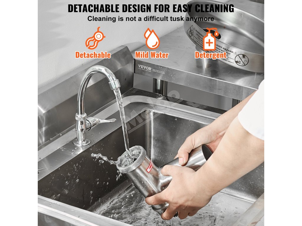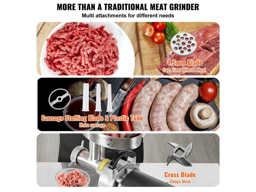 Komerčný mlynček na mäso obsahuje tri rôzne priemery trubiek na klobásy, vďaka čomu môžete ľahko vyrábať klobásy rôznych veľkostí. Ideálny na použitie v kuchyniach, baroch, reštauráciách a potravinárskych prevádzkach.
