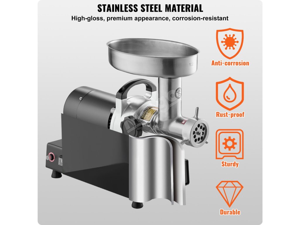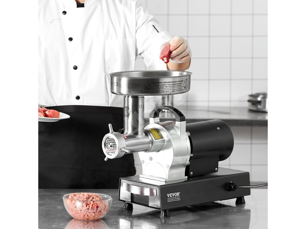 Komerčný stolový mlynček na mäso s veľkosťou úst 12# je vybavený vysoko účinným 550W motorom z čistej medi, ktorý dokáže zomlieť 9 libier mäsa za minútu. Je vyrobený z nehrdzavejúcej ocele, je robustný a odolný. Čepeľ SUS420, ktorá dokáže mlieť rôzne druhy mäsa, je ideálna na komerčné použitie.