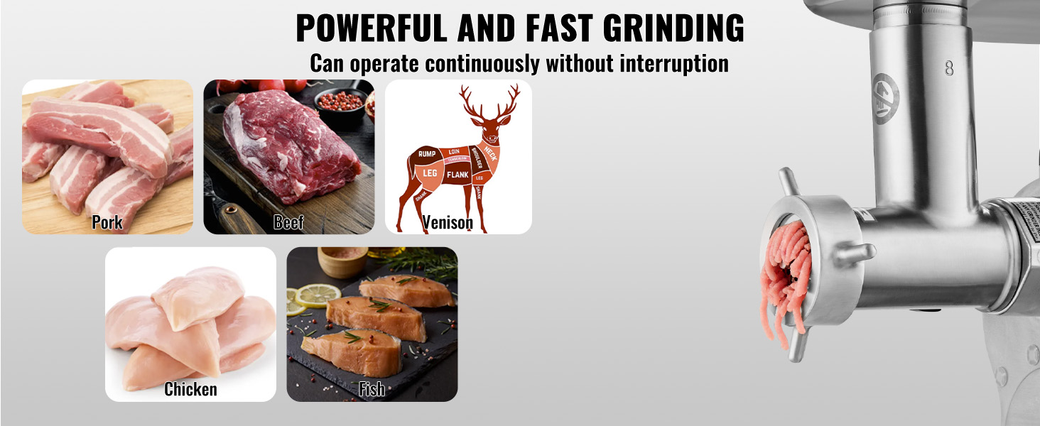 Motor z čistej medi s výkonom 350 W dokáže zomlieť 6 libier mäsa za minútu. Elektrický mlynček na mäso môže pracovať nepretržite bez prerušenia, takže je ideálny pre potreby komerčného mletia mäsa vo veľkom rozsahu.