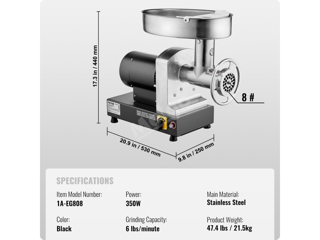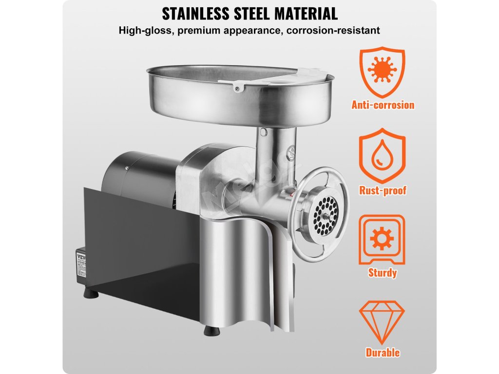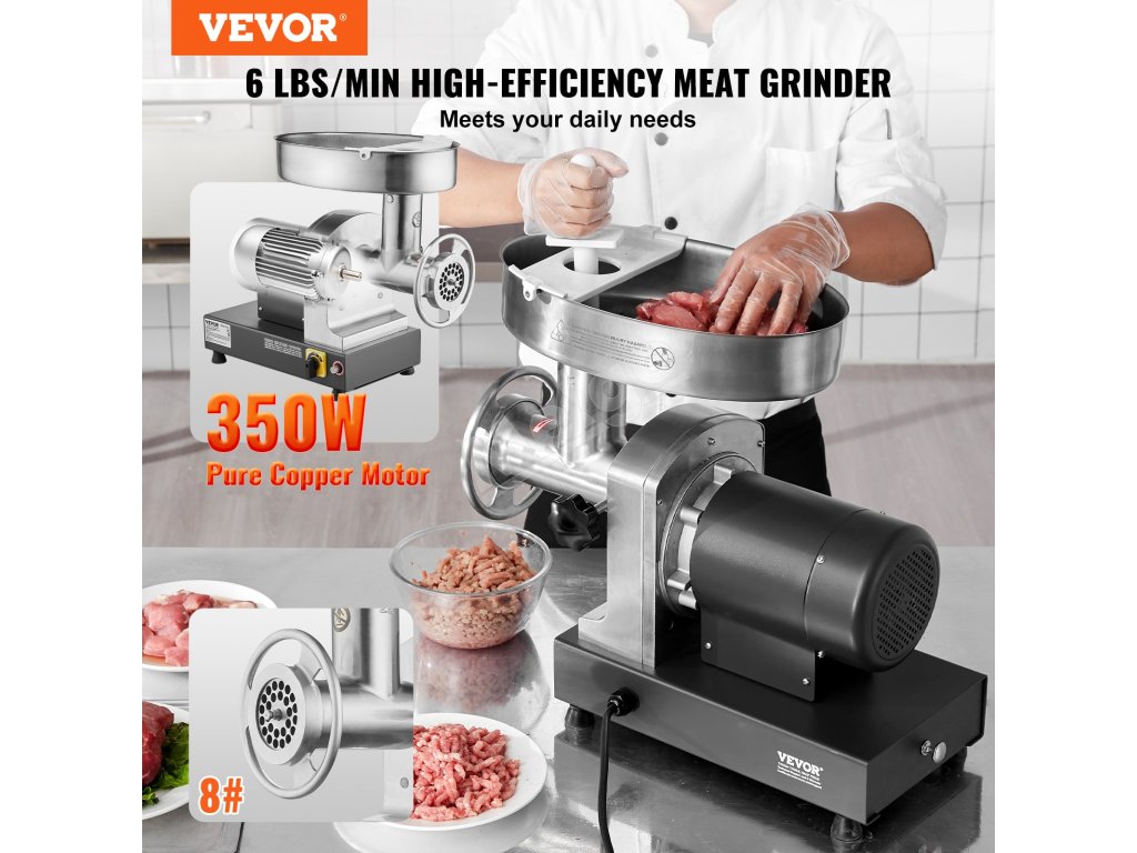 Komerčný stolový mlynček na mäso s veľkosťou úst 8# je vybavený vysoko účinným 350W motorom z čistej medi, ktorý dokáže zomlieť 6 libier mäsa za minútu. Je vyrobený z nehrdzavejúcej ocele, je robustný a odolný. Čepeľ SUS420, ktorá dokáže mlieť rôzne druhy mäsa, je ideálna na komerčné použitie.