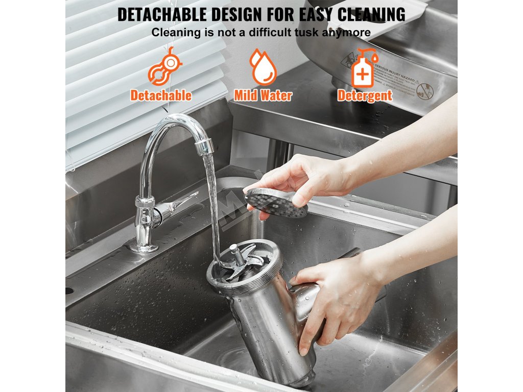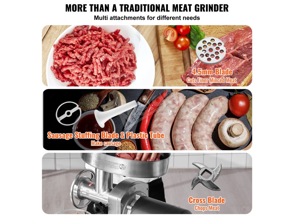 Komerčný mlynček na mäso obsahuje tri rôzne priemery trubiek na klobásy, vďaka čomu môžete ľahko vyrábať klobásy rôznych veľkostí. Ideálny na použitie v kuchyniach, baroch, reštauráciách a potravinárskych prevádzkach.