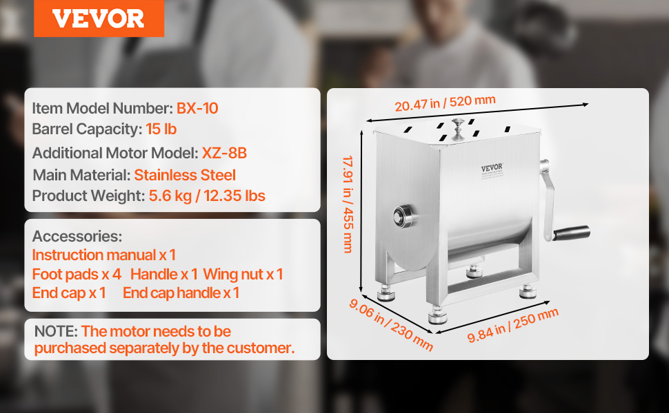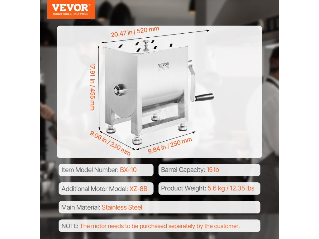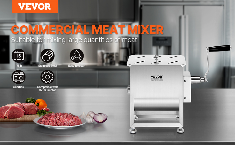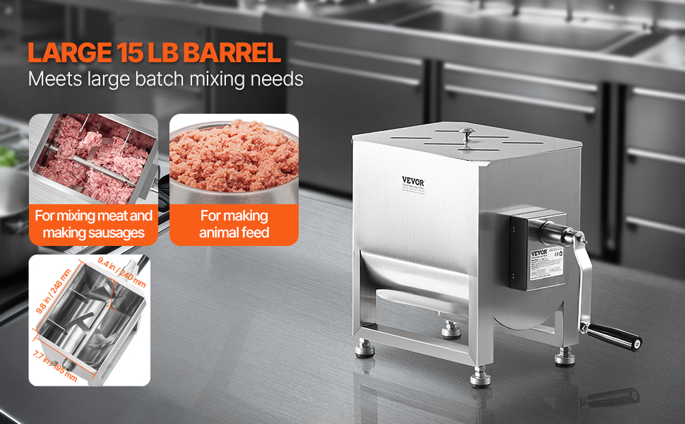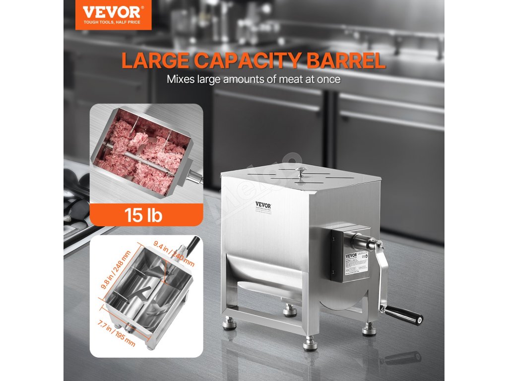 Mixér na mäso má nádrž s kapacitou 15 libier, ktorá je ideálna na miešanie mäsa s omáčkami a korením. Možno ho použiť na výrobu klobás, iných pochúťok alebo dokonca na prípravu krmiva pre zvieratá.