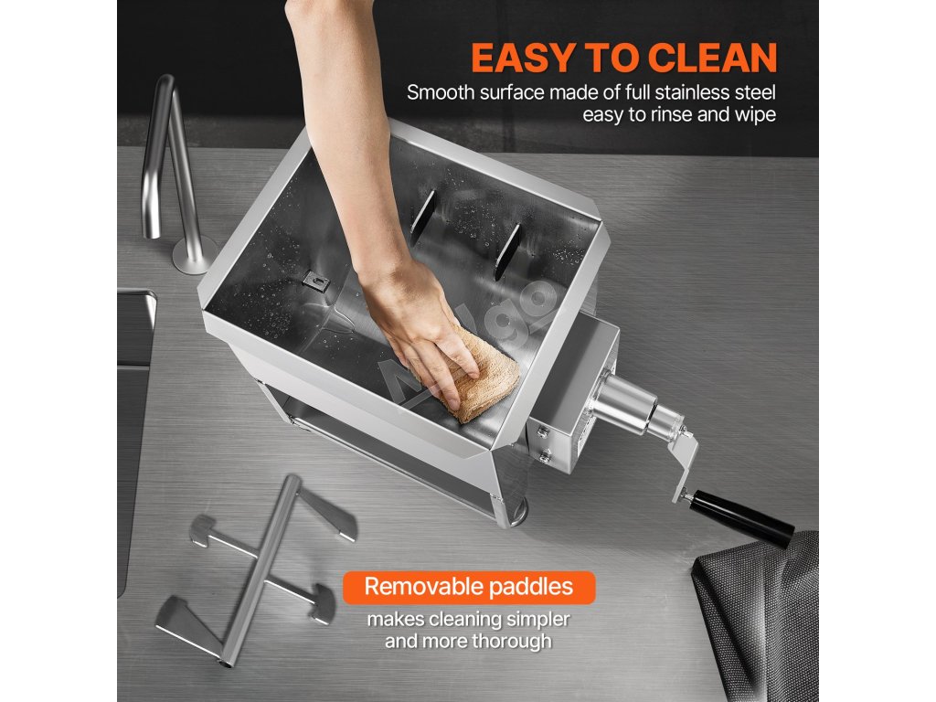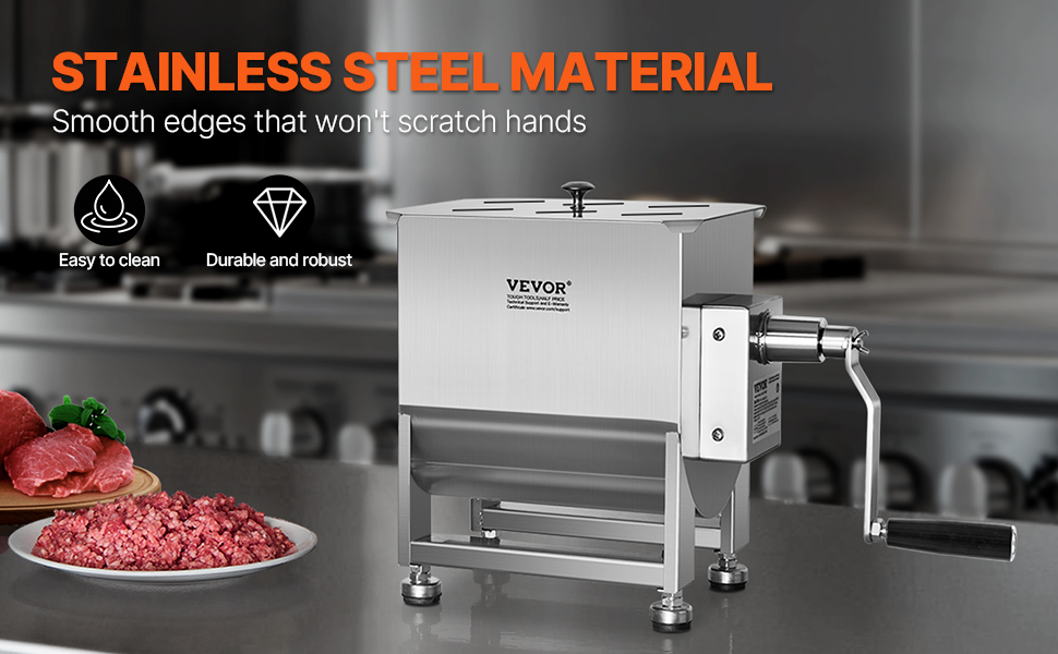 Tento 15-librový mixér na mäso je vyrobený z odolnej nehrdzavejúcej ocele 201, ktorá zaručuje dlhodobú pevnosť. Ľahko sa ovláda a dokáže účinne premiešať veľké množstvá rôznych druhov mäsa.