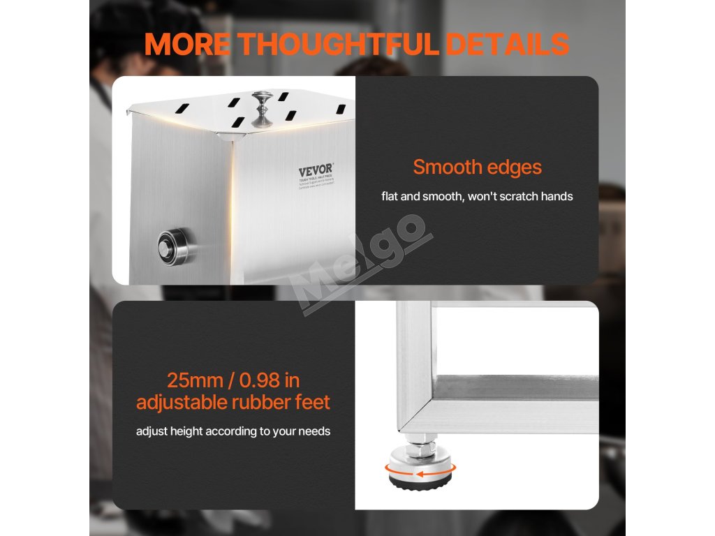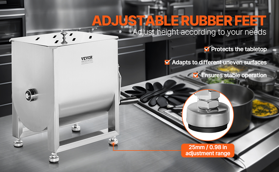 Komerčný ručný mixér na mäso je vybavený nastaviteľnými gumovými nožičkami, ktoré umožňujú nastavenie výšky o 25 mm. Táto konštrukcia pomáha chrániť povrch a zároveň zabezpečuje stabilnú prevádzku.