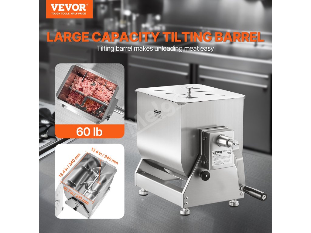 Mixér na mäso sa dodáva s nádržou s kapacitou 60 libier, ktorá je ideálna na mixovanie mäsa s omáčkami a korením. Je ideálny na výrobu klobás, iných pochúťok alebo krmiva pre zvieratá. Naklápacia konštrukcia uľahčuje vykladanie mäsa.