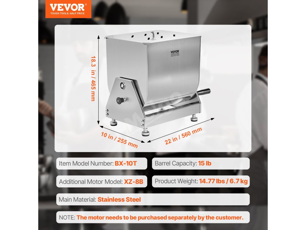 Mixér na mäso sa dodáva s nádržou s kapacitou 15 libier, ktorá je ideálna na mixovanie mäsa s omáčkami a korením. Je ideálny na výrobu klobás, iných pochúťok alebo krmiva pre zvieratá. Naklápacia konštrukcia uľahčuje vykladanie mäsa.
