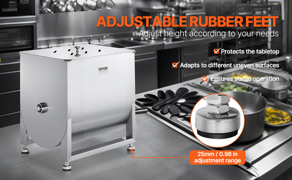 Komerčný ručný mixér na mäso je vybavený nastaviteľnými gumovými nožičkami, ktoré umožňujú nastavenie výšky o 25 mm. Táto konštrukcia pomáha chrániť povrch a zároveň zabezpečuje stabilnú prevádzku.