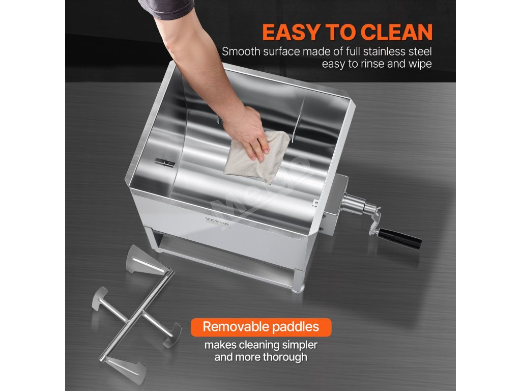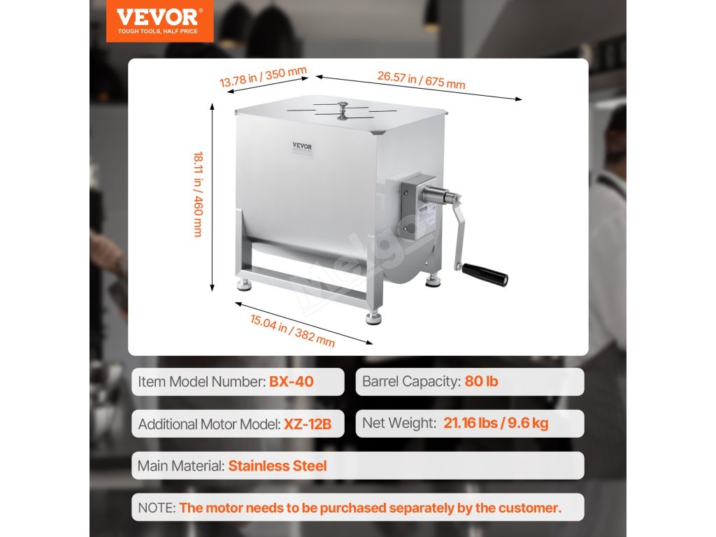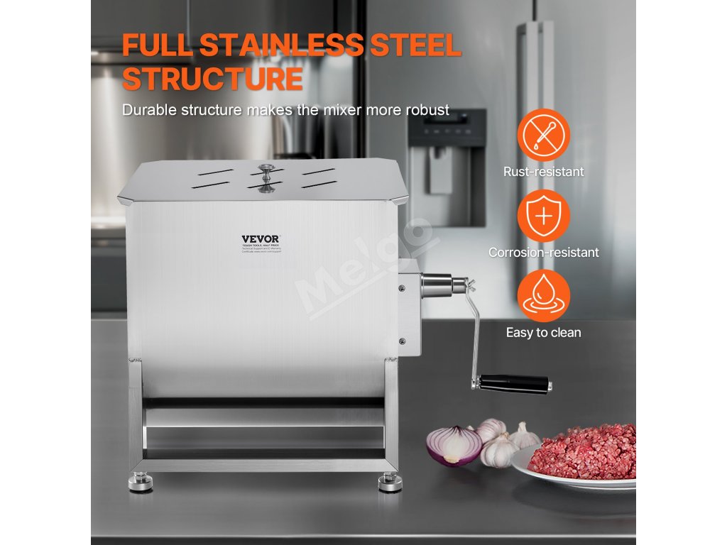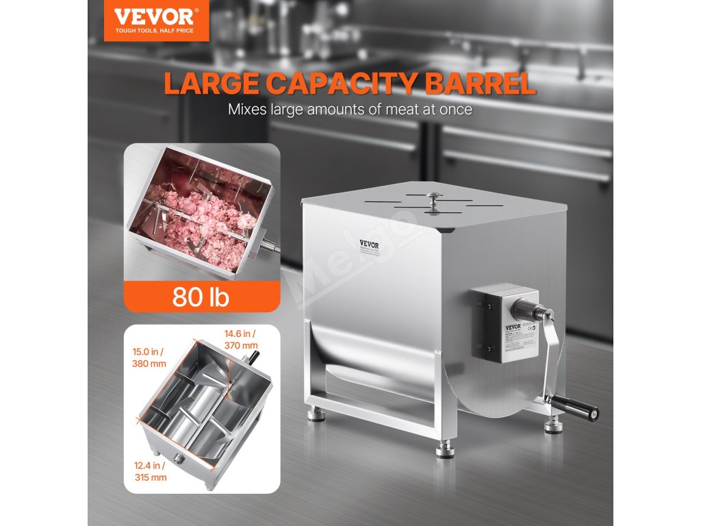 Mixér na mäso má nádrž s kapacitou 80 libier, ktorá je ideálna na mixovanie mäsa s omáčkami a korením. Možno ho použiť na výrobu klobás, iných pochúťok alebo dokonca na prípravu krmiva pre zvieratá.