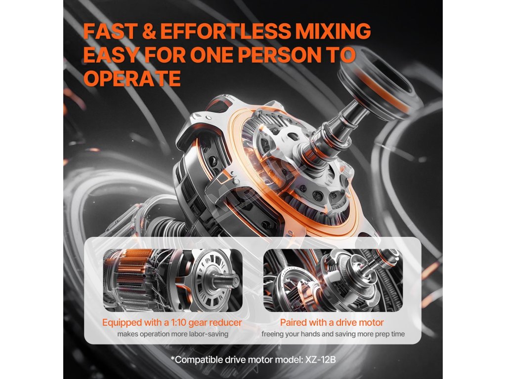 Konštrukcia prevodovky uľahčuje miešanie v spojení s pohonnými motormi VEVOR XZ-8B/XZ-12B. Uvoľní vám ruky a umožní rýchlejšie a rovnomernejšie miešanie.