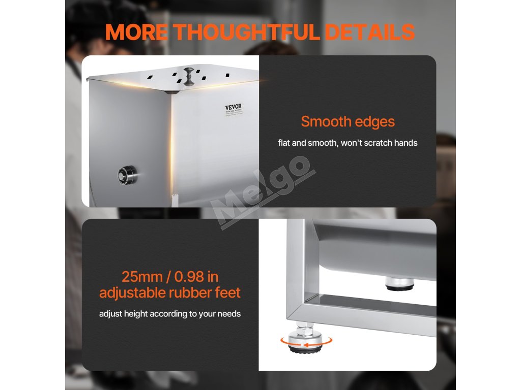 Komerčný ručný mixér na mäso je vybavený nastaviteľnými gumovými nožičkami, ktoré umožňujú nastavenie výšky o 25 mm. Táto konštrukcia pomáha chrániť povrch a zároveň zabezpečuje stabilnú prevádzku.