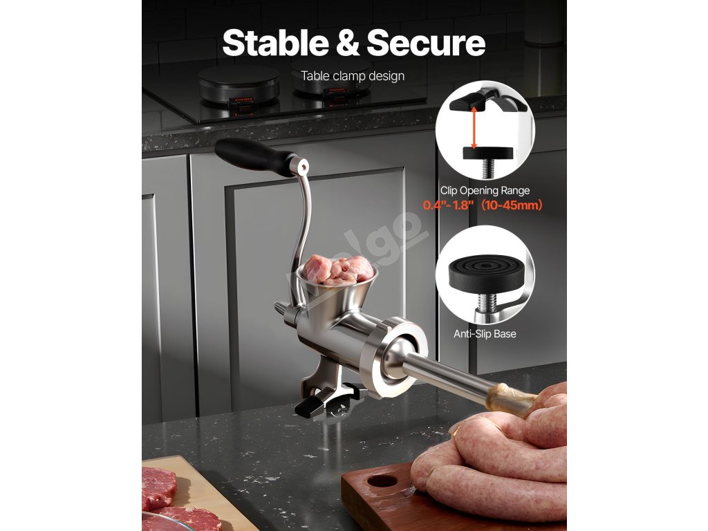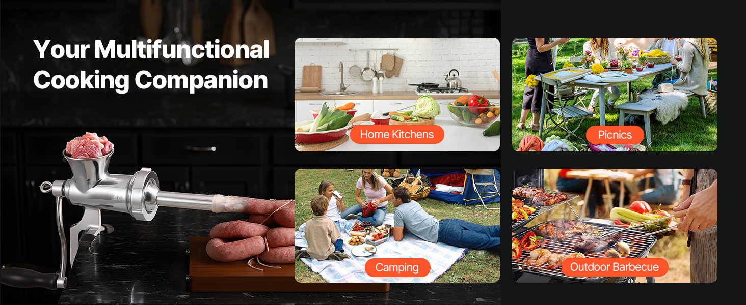 Tento ručný mlynček na klobásy je ľahký a kompaktný a je ideálny do vašej kuchyne, na pikniky, vonkajšie grilovanie a kempovanie. Premeňte akýkoľvek priestor na svoju kreatívnu kuchynskú zónu a užite si radosť z domácich jedál.