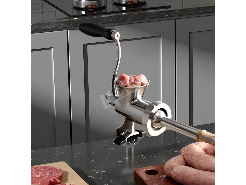 Ručný mlynček na mäso nerez 304 s kľukou, svorkou, 2 sitá, plnička