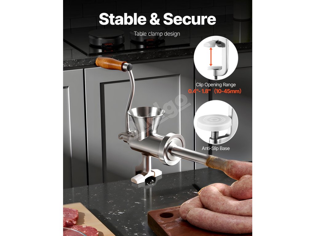 Robustná svorka sa pevne pripevní k doske stola a ponúka kompaktný dizajn, ktorý spĺňa vaše každodenné potreby pri varení. Vychutnajte si radosť z varenia zakaždým s naším multifunkčným ručným mlynčekom na mäso.