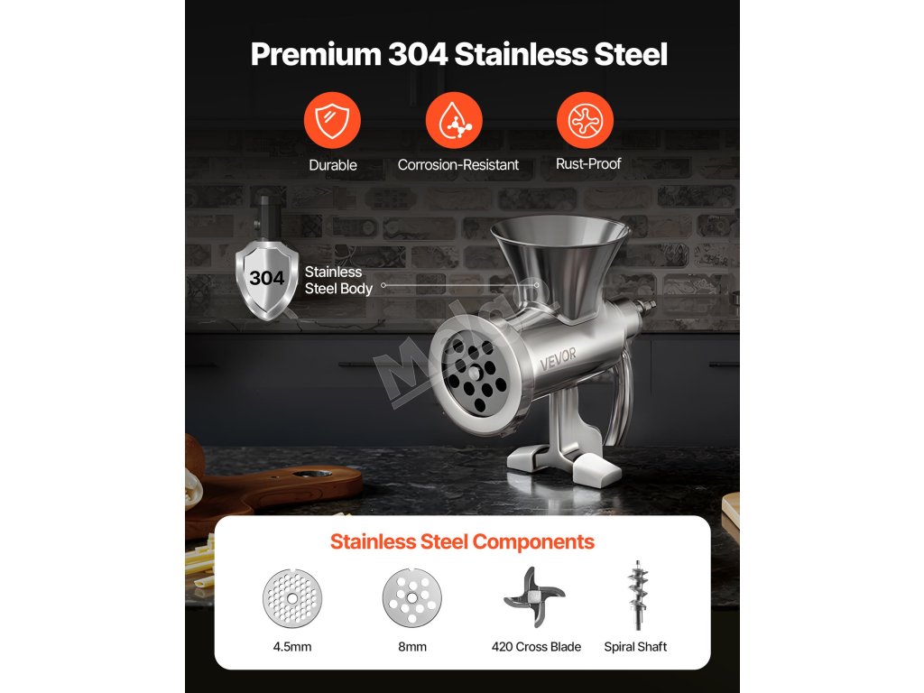 Ručný mlynček na mäso nerez 304 s ručnou kľukou, 2 sitká, 4 nástavce