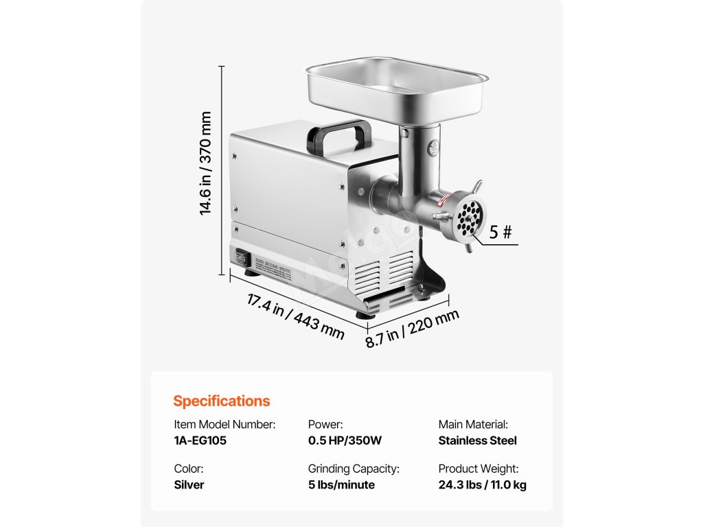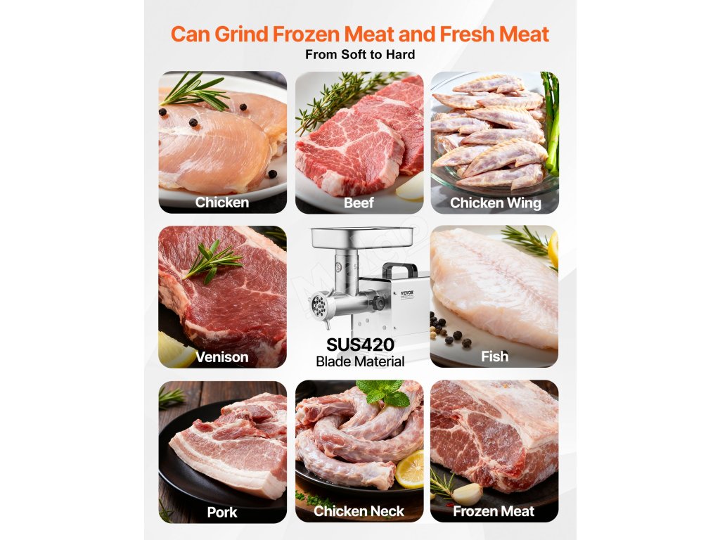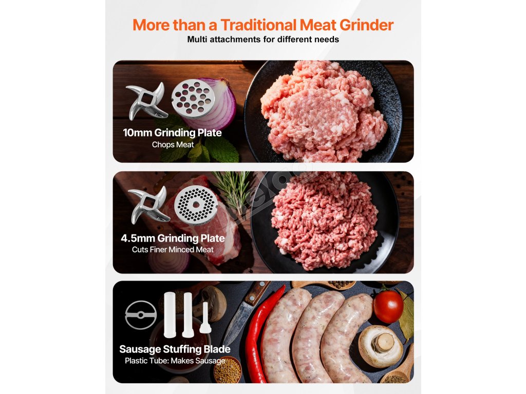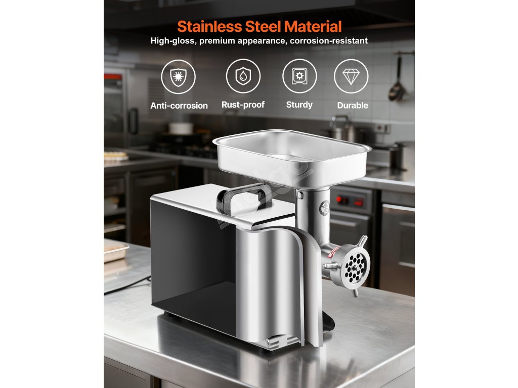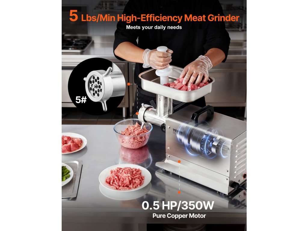 Motor z čistej medi s výkonom 300 W dokáže zomlieť 5 libier mäsa za minútu. Elektrický mlynček na mäso môže pracovať nepretržite bez prerušenia, takže je ideálny pre potreby komerčného mletia mäsa vo veľkom rozsahu.
