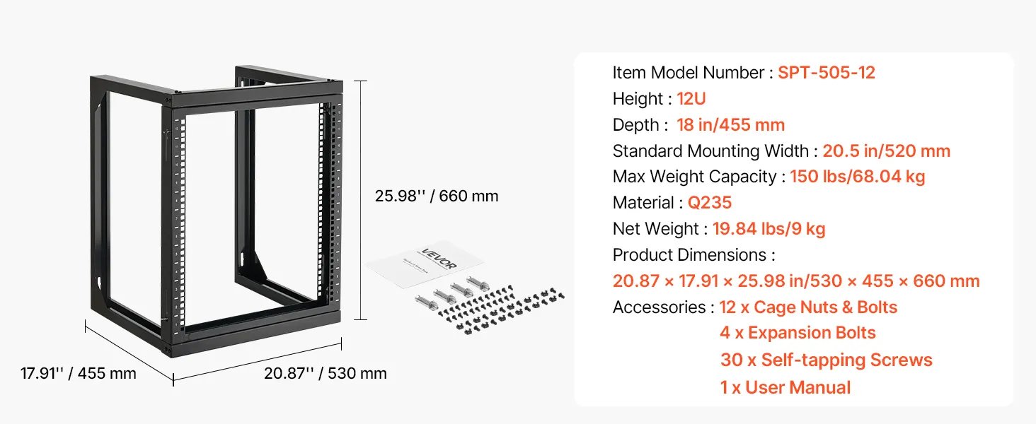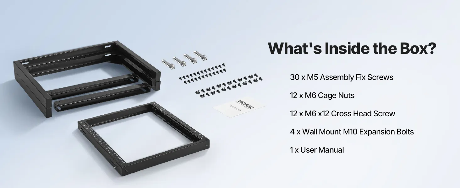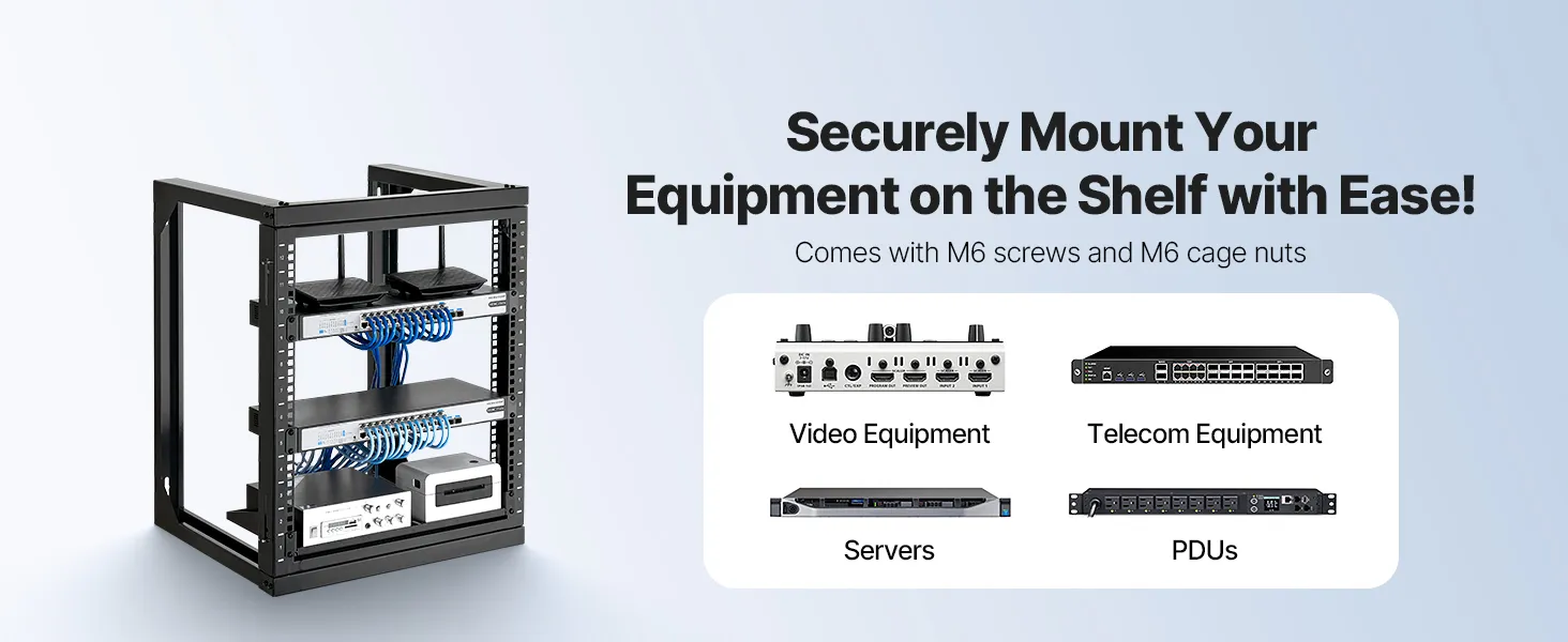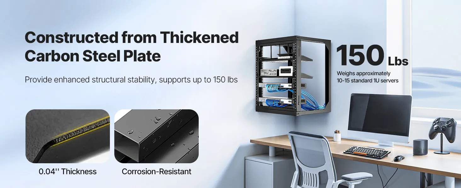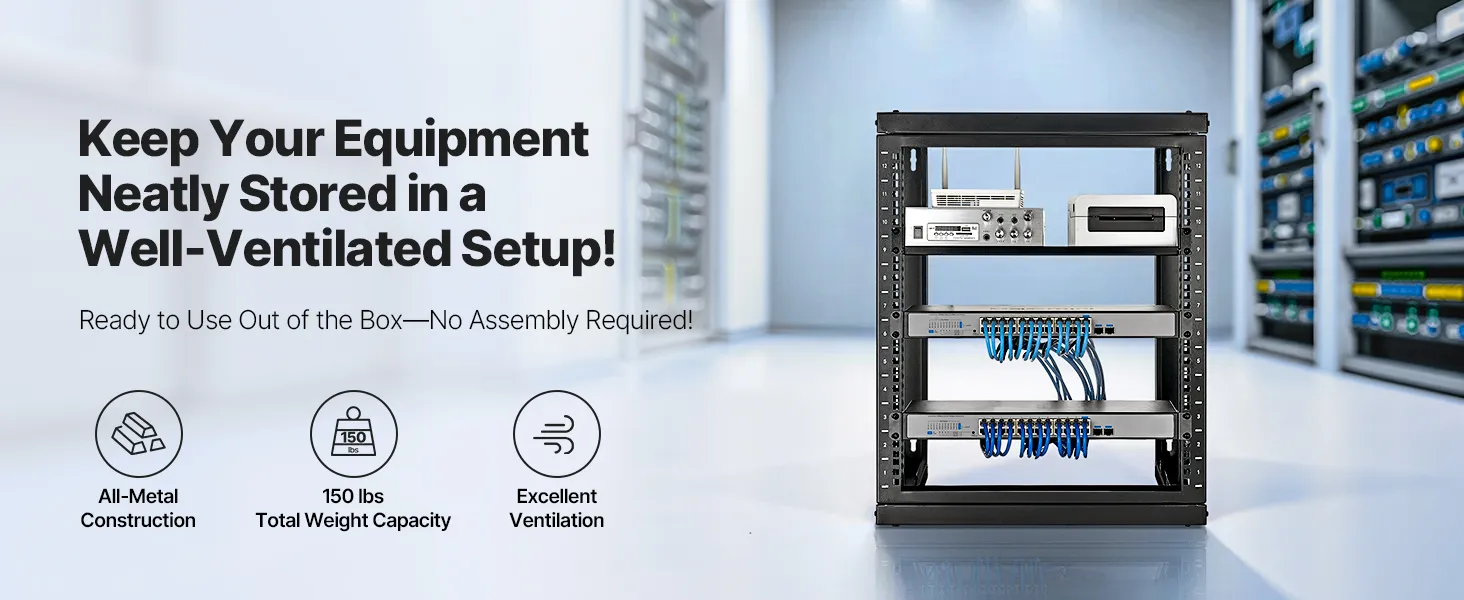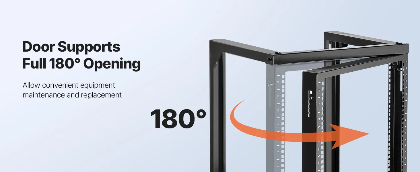Náš sieťový stojan je vybavený otvorenými výklopnými dverami, ktoré umožňujú otváranie v uhle 180°. Vďaka pevnej konštrukcii z uhlíkovej ocele unesie až 150 libier (68 kg) a udrží vaše zariadenia stabilné. Vďaka kompletnému príslušenstvu môžete bezpečne namontovať prepínače alebo iné sieťové zariadenia priamo na stojan!