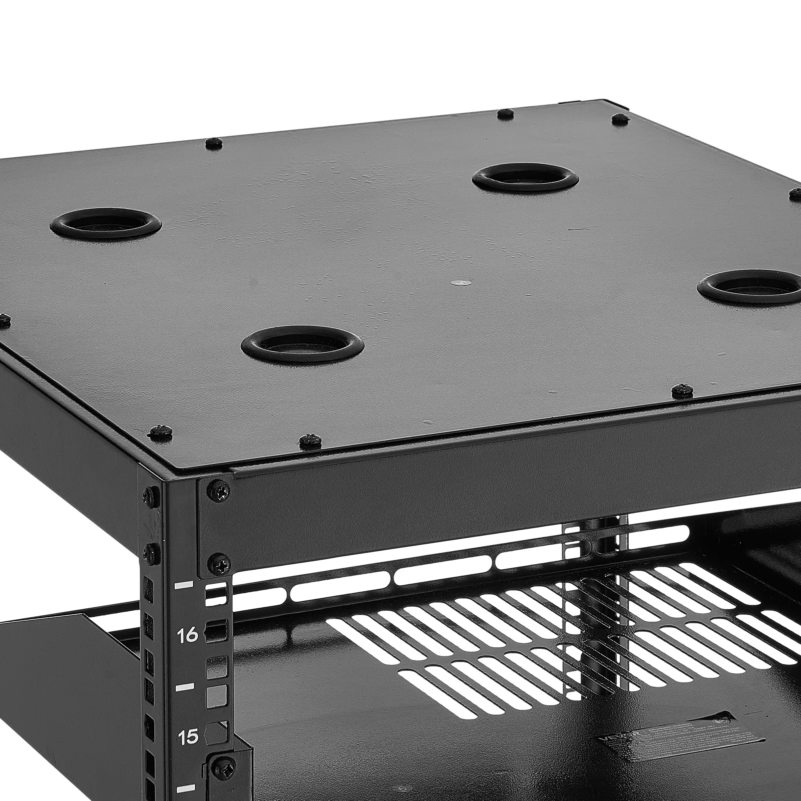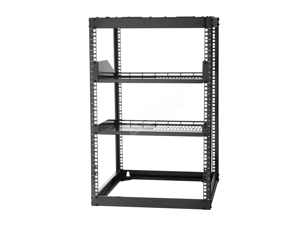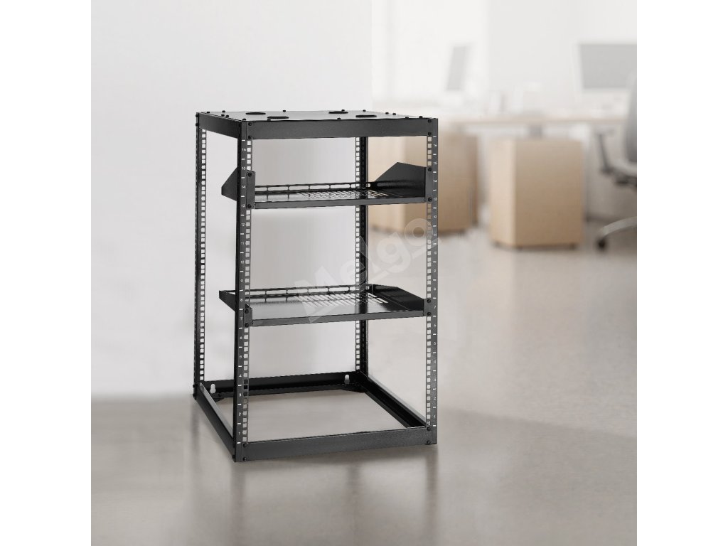 Otvorený 16U rack 585 mm, 4-stĺpový, stena/podlaha, vetrané police