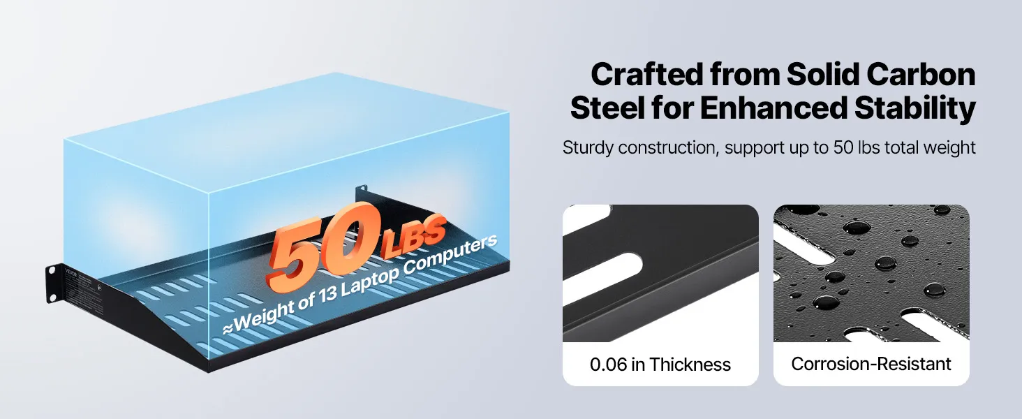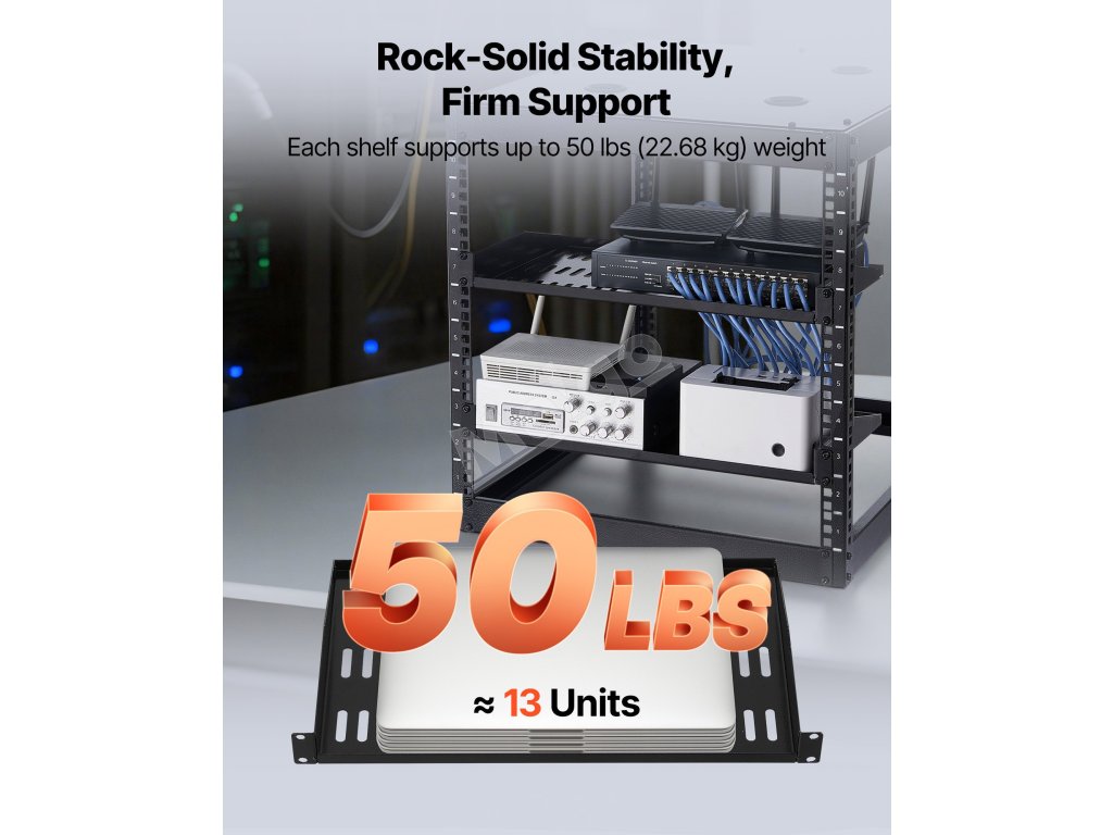Táto polica do serverového stojana poskytuje robustnú konštrukciu, ktorá unesie až 50 lbs/22,68 kg.