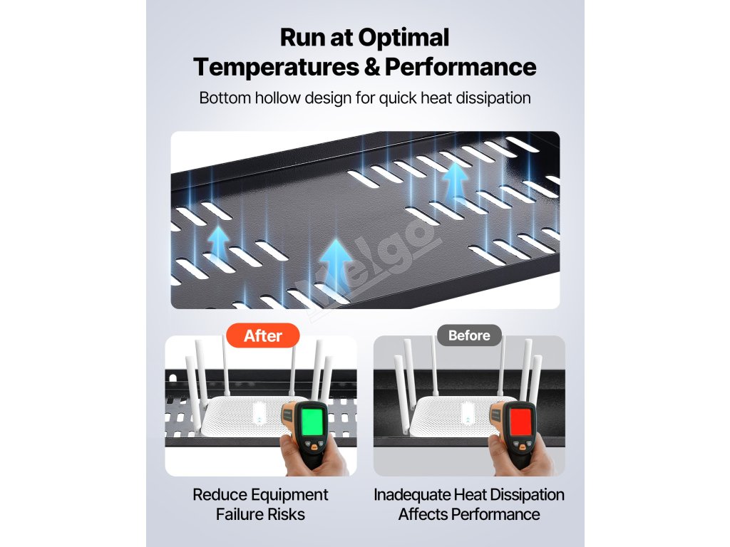 Vďaka odvetrávanej konštrukcii základne zabezpečuje táto sieťová polica do racku rýchly odvod tepla zo zariadenia.