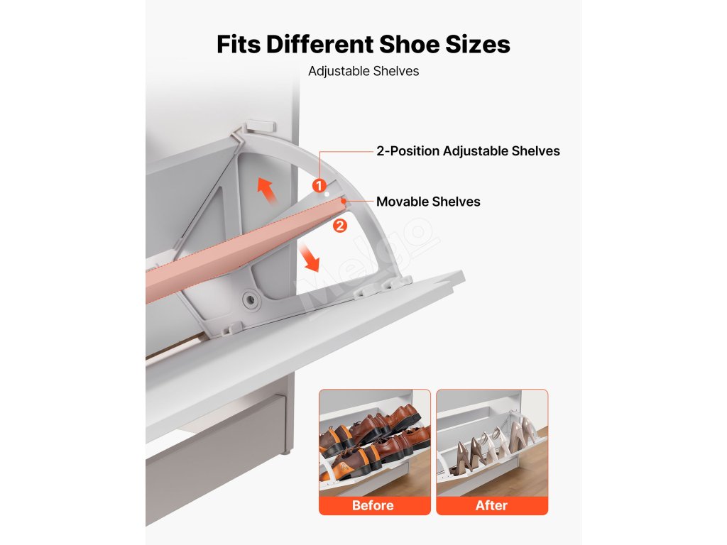 Pohyblivé police pojmú obuv rôznych veľkostí a výšok - od papúč a tenisiek až po podpätky a vysoké topánky - a udržia obuv celej rodiny prehľadne uloženú.