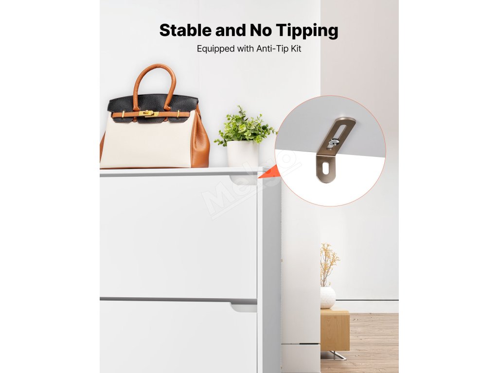 Vybavená zariadením proti prevráteniu, ktoré bezpečne upevní skrinku na topánky k stene, čím sa zabráni náhodnému prevráteniu a zvýši sa stabilita.