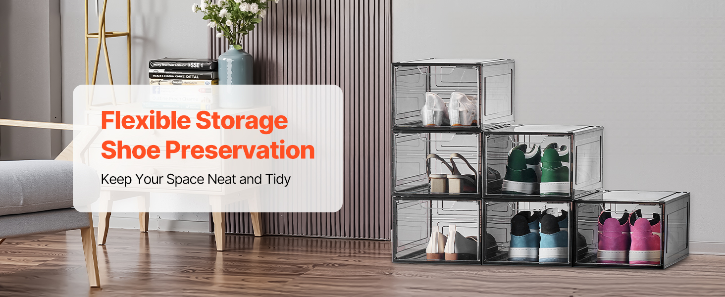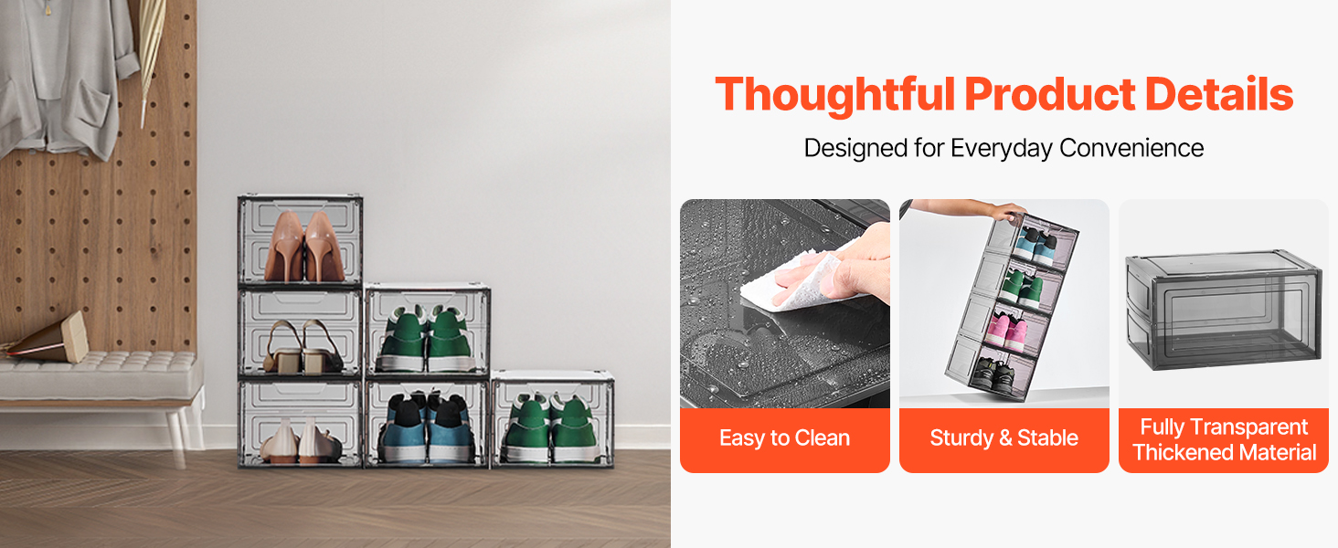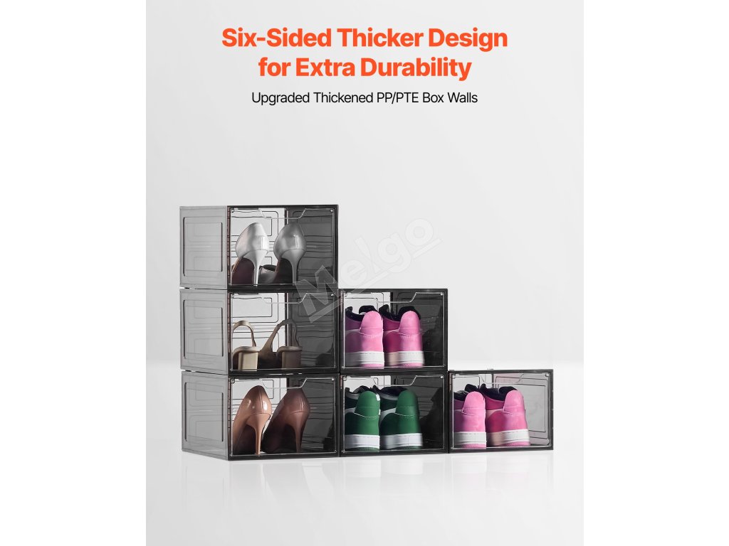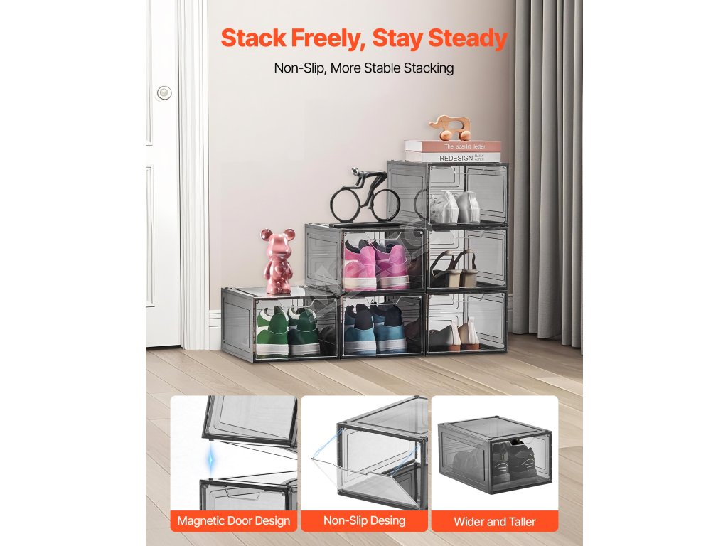 Priehľadné boxy na topánky uskladnia viac topánok a drobných predmetov a zároveň zabezpečia stabilitu vďaka silnej nosnosti a protišmykovej konštrukcii, čím poskytujú bezpečné riešenie na uskladnenie vašej obuvi.